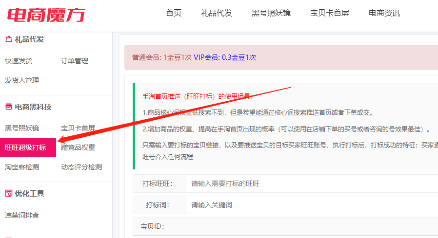 第一步:我们得用电商魔方这个运营工具。这里面有一个非常棒的功能叫做“旺旺超级打标”。这个功能能够帮助你的新品迅速吸引到新品互动人群、新品潜力人群以及新品活跃人群,能让淘宝系统给你推荐意向人群进店。
