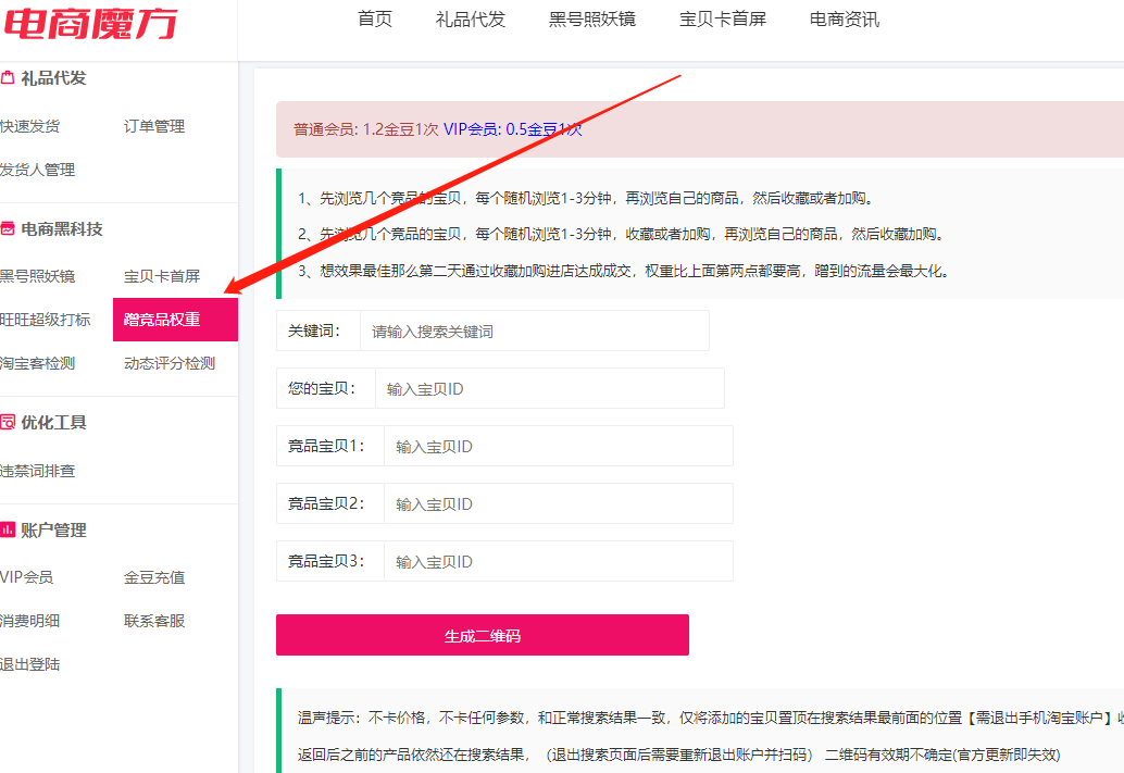 第二步:入池成功后,就要暂停“旺旺超级打标”计划,使用电商魔方里面的“增竞品权重”。这个工具会根据你设置的同行高销量的店铺人群,去全网匹配相似人群并且把同行意向人群拉倒你的店铺来,你就越能看到流量孟的效果。